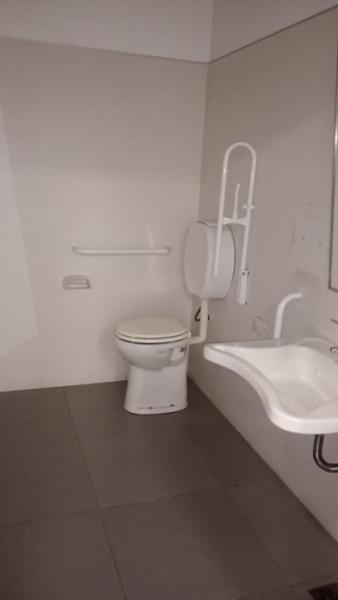 BAÑO DE DISCAPACITADO 3 x 2 m, con inodoro, extractor de aire, bacha de lavado espejo y sus agarres correspondientes.
